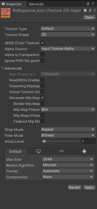 해당 이미지 속성중에 맨 아래쪽 Default탭의 Compression의 값을 "None"로 설정해 주면 되었다.