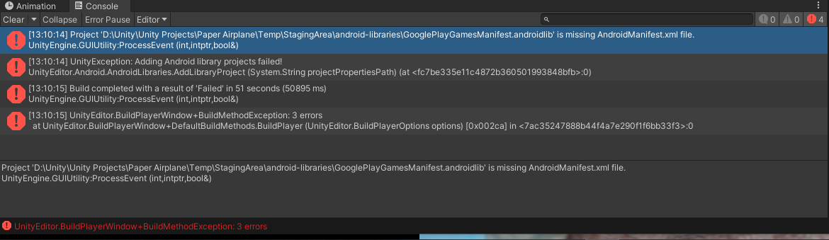 Project 'D:\Unity\Unity Projects\Paper Airplane\Temp\StagingArea\android-libraries\GooglePlayGamesManifest.androidlib' is missing AndroidManifest.xml file.